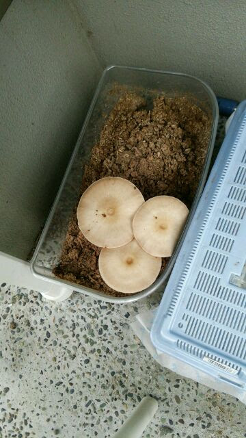 市販の甲虫マットは、クヌギなどのシイタケのほだぎを粉砕したものなどがおおく、キノコの菌糸が残っていたのでしょう。マットの中の微生物も、カブトムシの生育には大切なので、加熱して消毒するなどせず、出荷しているはずですから・・・。