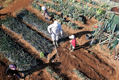 そうこうするうち、離れた畝では種芋の植付を開始。