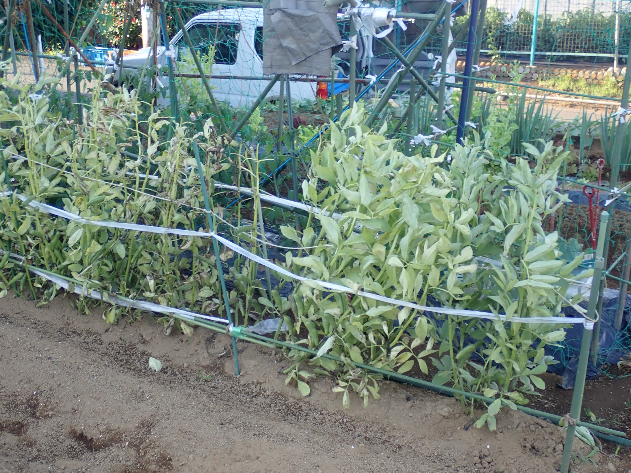 種採り用に、残しておいたソラマメは、すっかり黄色いものが増え、葉が散ったものがある。