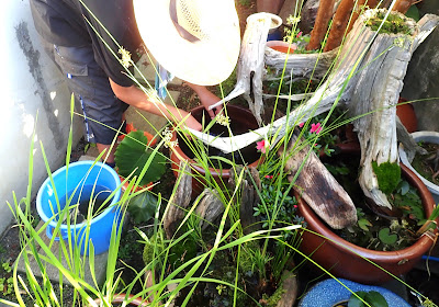 更に自宅の火鉢・漬物甕利用のビオトープには、羽化用の小枝をそれぞれ設置。