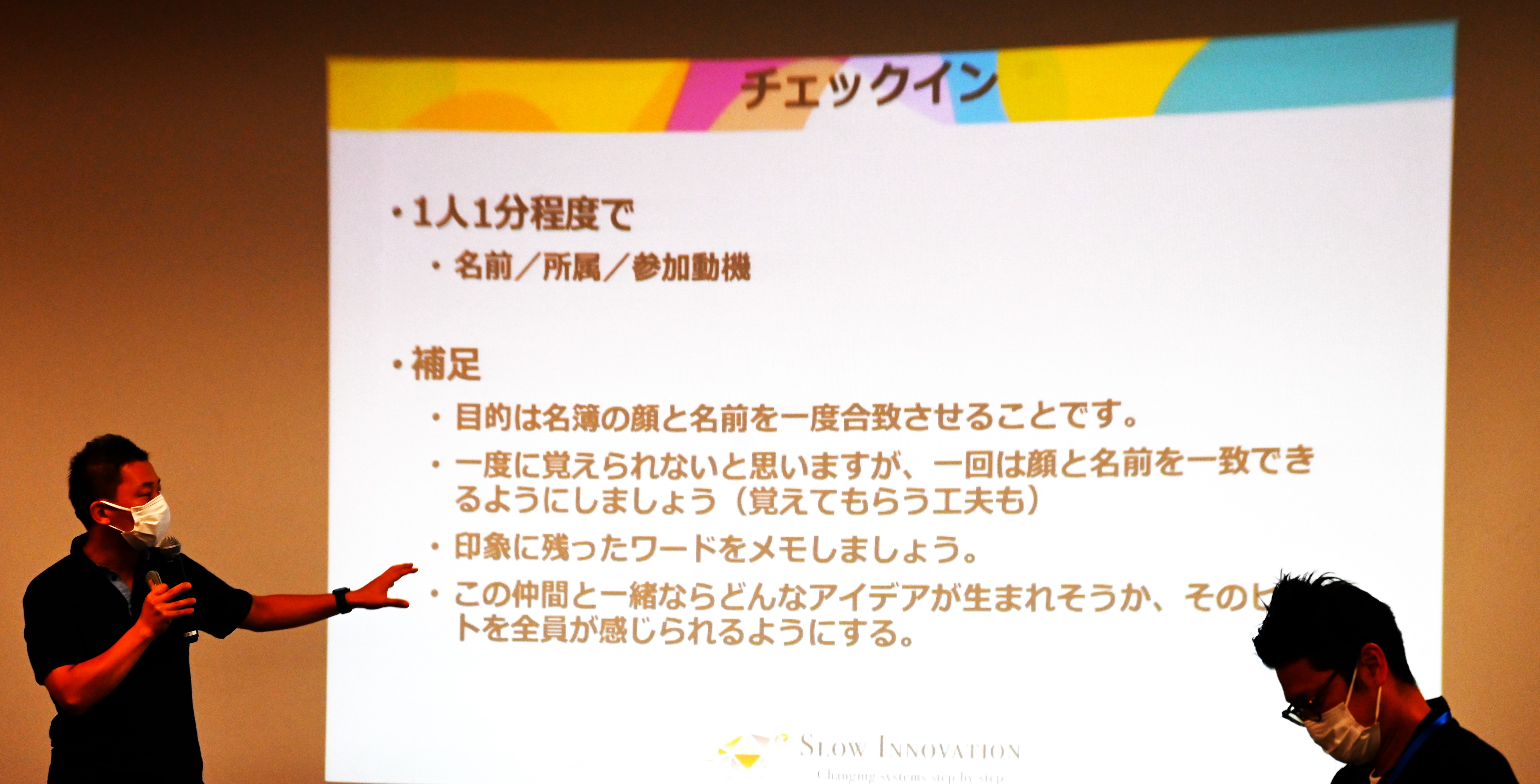 市の立場からの背景説明の後、具体的な進め方について、ファシリテーターから説明。
