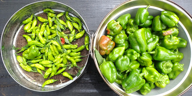 次週に伸ばしては、ミニトマトが割れてしまうので出来る範囲で収穫することにし、時間より早く専用畑に行き、ピーマンとシシトウを収穫開始。